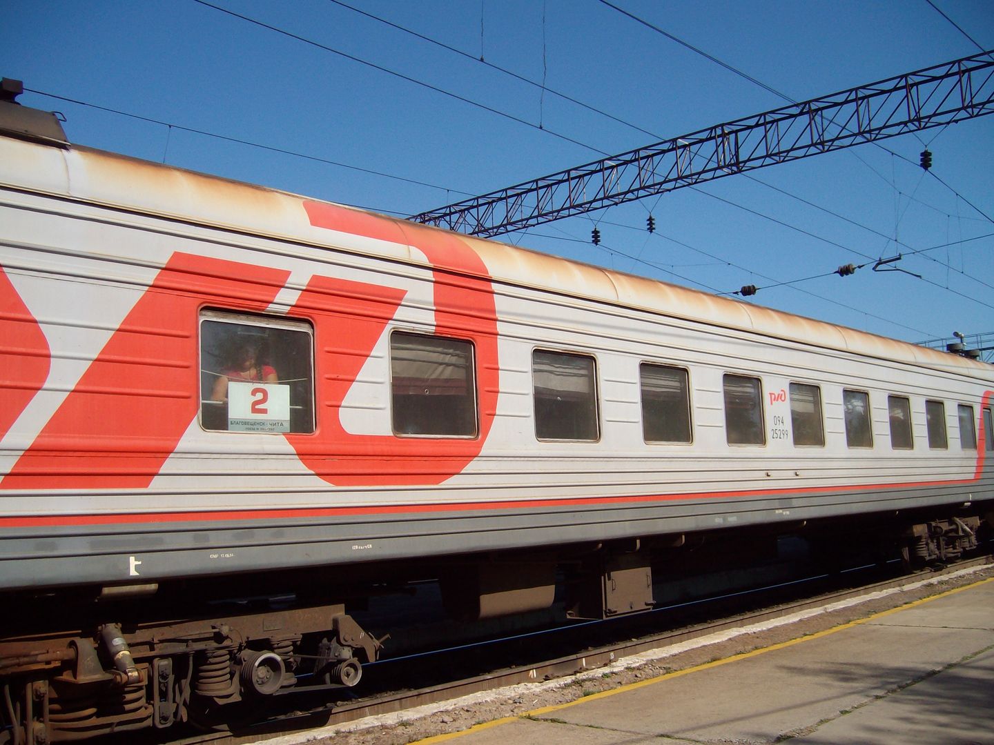 До Благовещенска удобнее всего добираться этим поездом, т.к. у адлерского неудобное расписание, а прицепка к 044 хабаровскому дороже (потому что поезд скорый). Состав таков: багажный, 4 плацкартных калины (из них 2 со стеклопакетами), один купейный в виде общего, 2 купе-аммендорфа, один аналогичный буфет. Плюс ещё в Сковородино прицепили 4 старых и страшных КВЗ