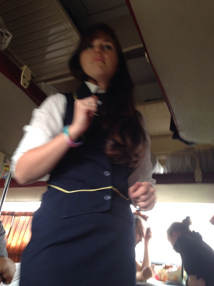Собирая билеты, она представлялась в каждом отсеке: "Я - Ксюша, я - ваш проводник, чай, кофе и т.д и т.п., я буду вас обслуживать во время поездки."