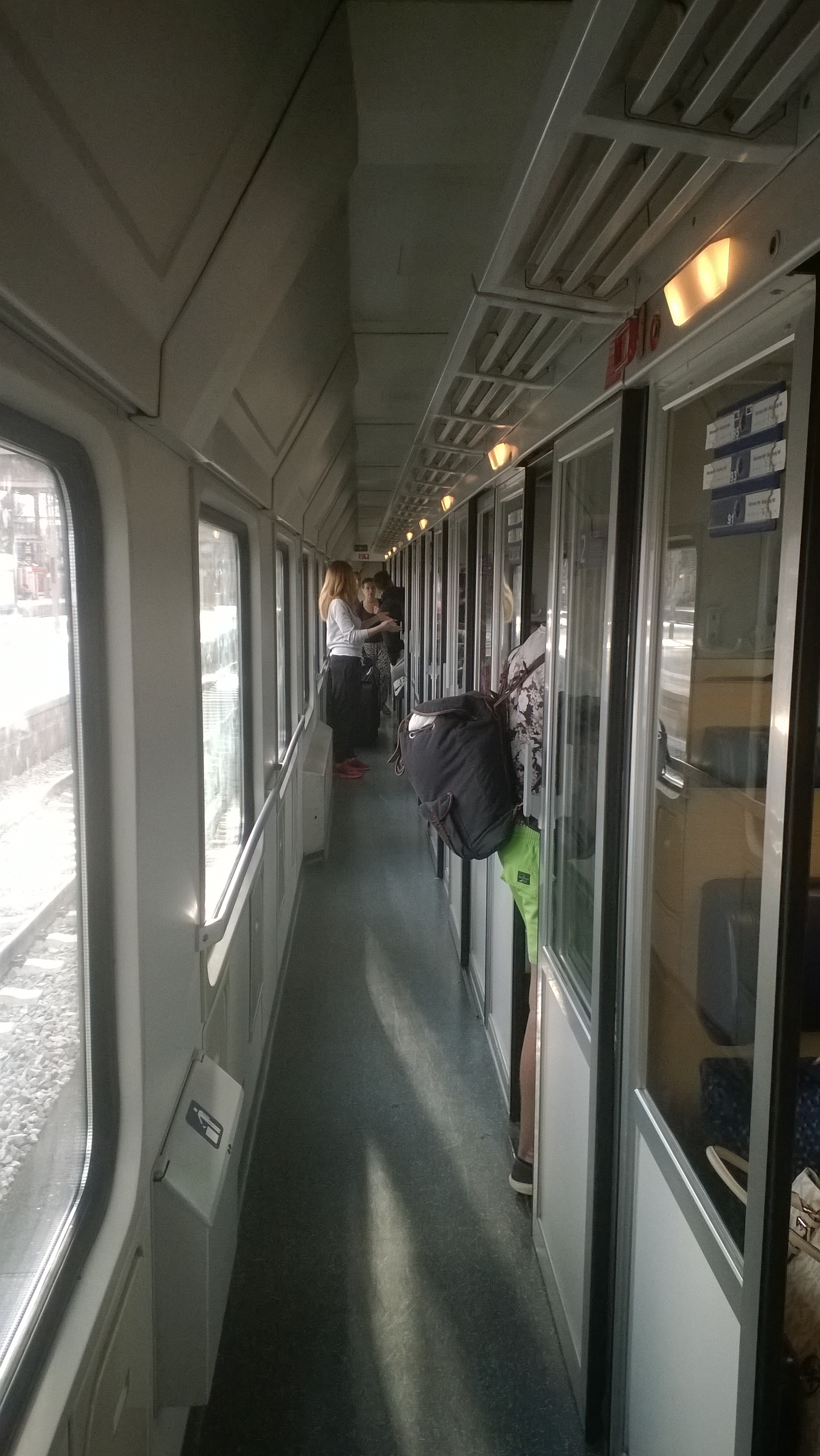 Поезд австрийский, формирования ÖBB, представляет собой электровоз, около 10 сидячих вагонов, а также вагон-ресторан. В составе есть купейные сидячки (один вагон 1-го класса и два-три вагона 2-го класса) и самолётные (2-ой класс). Мой вагон - самолётка, места по схеме 2+2, либо друг за другом, либо друг перед другом, а между ними столик.