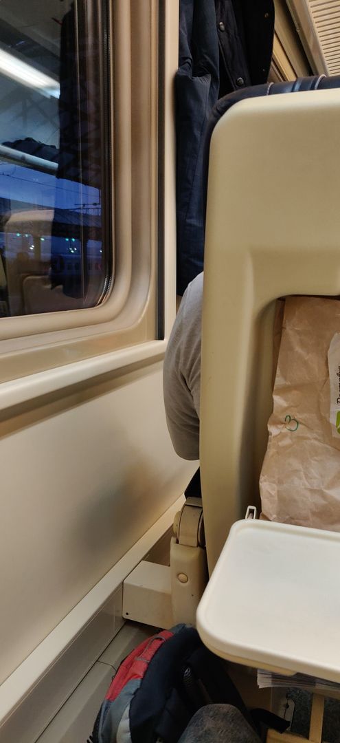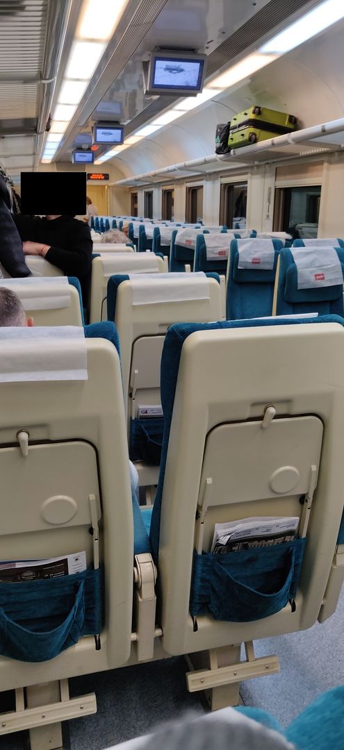 Внешний вид: все вагоны в стандартной раскраске РЖД (сейчас большинство фирменных такие, никакой уникальности в окраске и оформлении вагонов не осталось - к чему тогда вообще эти имена-названия поездам давать, пустой пшик). На полу в 1 классе - ковровая простите, коврово-резиновая дорожка, во 2 классе - самый простенький ковролин. Кресла в 1 классе развернуты с краев вагона к центру, во 2м - одна сторона вагона повернута по ходу движения, вторая сторона - в противоположную. Не встречал раньше такого... Решение крайне сомнительное, если честно, т.к. половина пассажиров оказываются почти лицом к лицу с соседями из противоположного ряда. В вагоне 1 класса за последними сиденьями были наставлены какие-то картонные коробки почти до самого потолка, что никак не добавляет поезду фирменности. По компоновке кресел: в 1Р сделано очень по-русски - дико большие проёмы между креслами, к окну или к стене не прислонишься, также видно все, что происходит у соседей впереди (и сзади), розетки в том ряду, который по 1 креслу в ряд, расположены, внимание.... внизу сбоку прямо возле кожуха радиатора, поэтому если у вас не миниатюрная зарядка, впихнуть в эту розетку ее просто физически не получится. Во 2 классе, кстати, розетки по-человечески сделаны (по одной на КАЖДОГО пассажира) - внизу между креслами. Столики в креслах разве что раскладываются, но никак не регулируются. Система опускания спинок - "щас прижму соседа сзади", ни о каком раскладывании спинки "вовнутрь" речи нет, естественно.