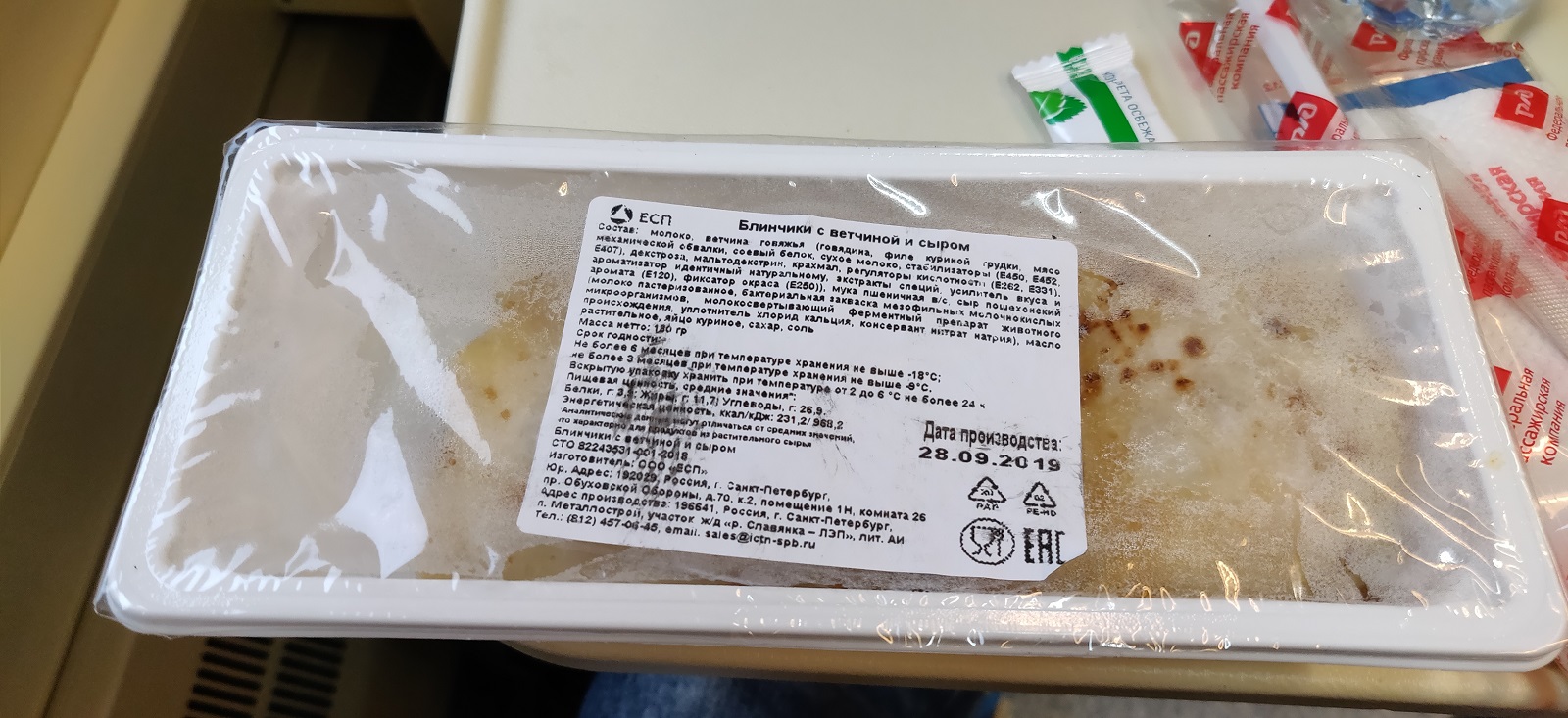 Питание в вагоне: меня до сих пор возмущает (но не удивляет, к сожалению) отношение РЖД к предоплаченному питанию: практически не важно, в какой класс ты берешь билет (я побывал во всех, кроме Мягкого и Люкса), рационы везде а-ля "мы затарились в ближайшей Пятёрочке по акции". Нет, правда, в классы "бизнес" (купе или сидячий) берут билеты люди, которые вряд ли ходят вокруг полок с "Красной ценой" в той же Пятерочке или Дикси, и подобный корм (простите, по другому не скажешь) в составе рациона питания, который уже включен в билет, им (и мне) вряд ли интересен. Из горячего предлагались блинчики, рис с курицей и тушеные овощи с грибами. Конечно, без "фирменной" получёрствой булочки не обошлось, а в составе сухой части рациона по традиции - какая-то дичь в виде шоколадного батончика категории "супер-эконом". Нет, ну нельзя что ли вместо этого Г... пару конфеток известного бренда положить, что ли?? Или я сладости, например, не ем (особенно такие!) - положили бы что-нибудь нейтральное. Ну да ладно... Сахар упорно в сухпаёк не кладут - типа намёк, покупайте отдельно за 5 руб. у проводника. А вот соль и перец почему-то для любимых пассажиров не жалко. И мятная конфета (решил впервые её попробовать) оказалась крайне сухая и безвкусная. Даже на такой мелочи сэкономили - нашли самого убогого производителя, наверное. Также на фото - состав блинчиков. Нет, они на самом деле оказались вкусными... но состав... пугает, мягко говоря.