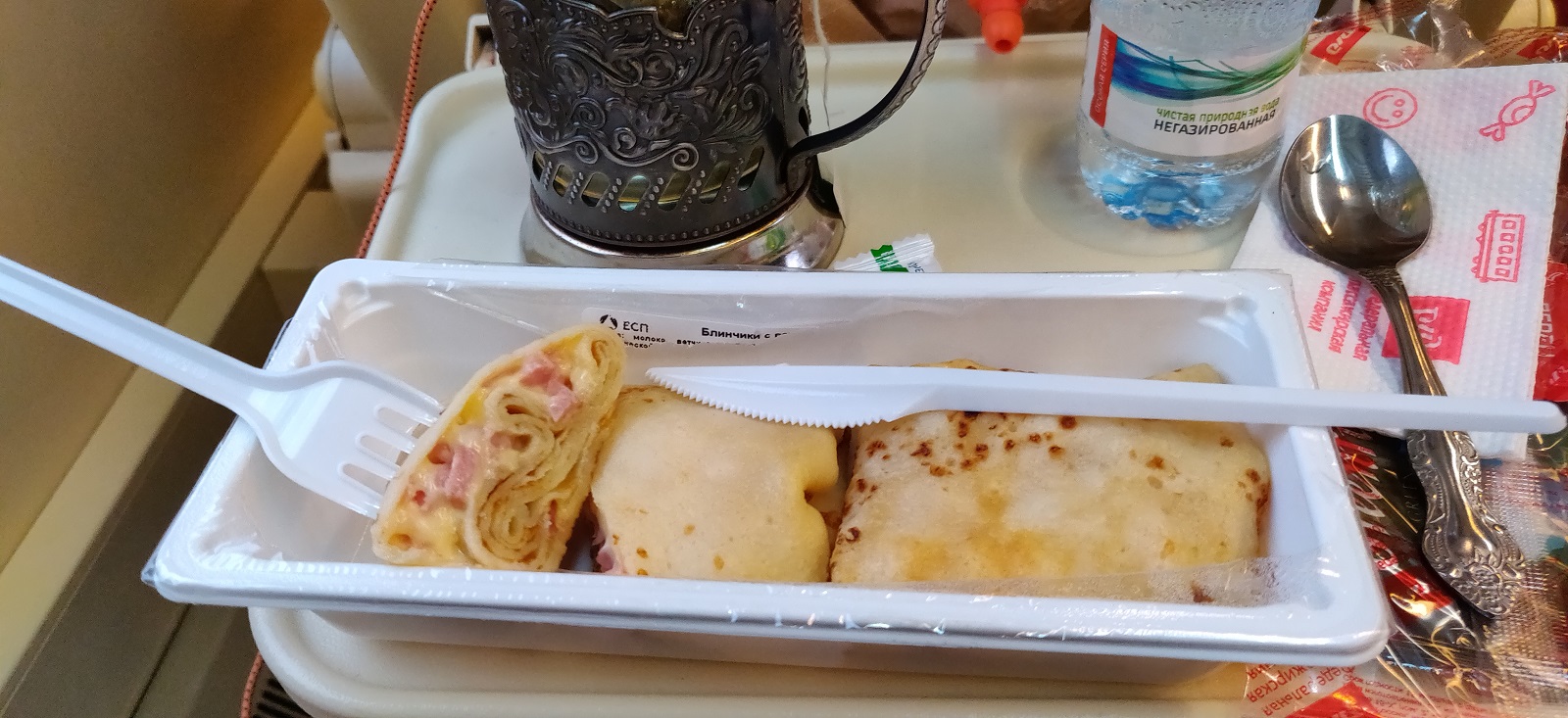 Об этом так же сообщила проводник и сказала, что придет официант из вагона ресторана, уточнит, чтобы я хотел на завтрак. Правда, через некоторое время проводник сама уточнила и передала пожелания официанту, официант принесла горячие блинчики с ветчиной и сыром.