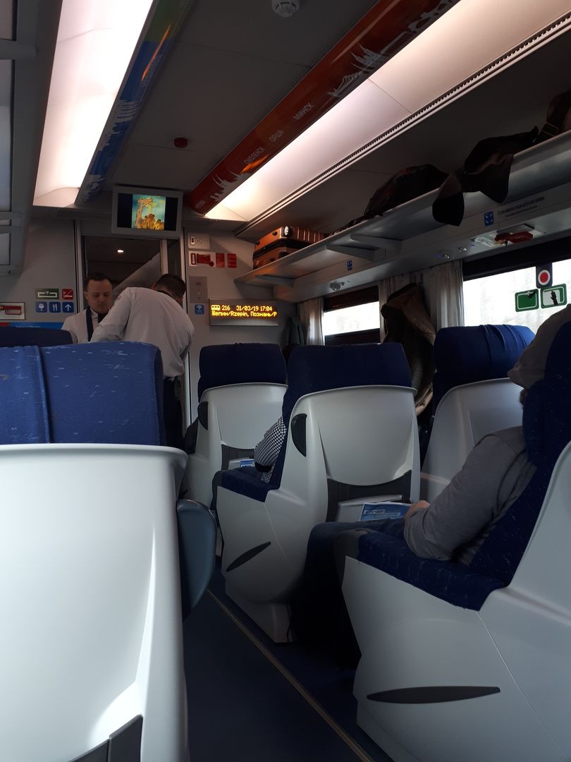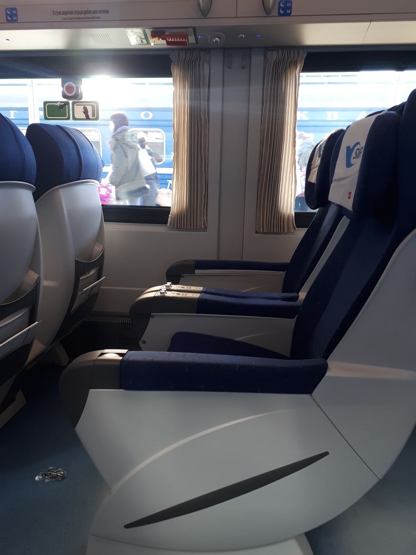 1) Дата поездки: 29.03.2019 г. по маршруту Москва - Смоленск, 31.03.2019 г. по маршруту Смоленск - Москва. В первом случае билеты за сутки до отправления, т.е. в четверг, во втором в субботу, после 19:30 появились в продаже (по отправлению из Берлина). Вагоны: 217 и 216 (сидячка 1 класса, класс обслуживания - 1Р). Брал места 15 и 19, в одиночном ряду (15 место лучше, прям у окна, на 19 окно чуть дальше). Из Москвы - вперед спиной, из Смоленска - лицом по ходу движения (все места).