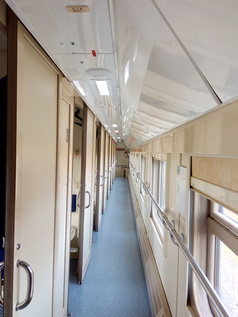 Вагоны были вперемежку серые PID, и в полосочку серый-бежевый-красный. Мой вагон был в полосочку. Стандартное замечание ко всем новым вагонам - когда зашёл в поезд, было ужасно душно. Что неудивительно, т.к. на весь поезд две форточки в коридоре на 1 этаже, и две на 2 этаже. Но на 1 этаже было всё же чуть попрохладнее.