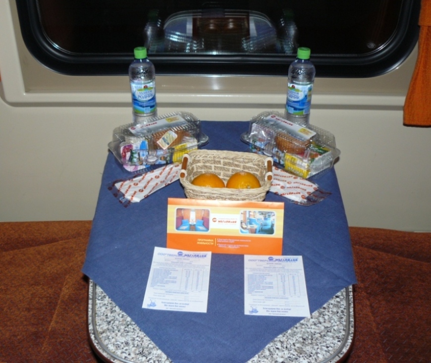 Обслуживание - на высочайшем уровне. Проводница Надежда Ивановна - сама вежливость и обходительность, несколько раз после оправления предлагала чай и закуски. Чай подавался в металлическом сервизе. Стоимость чая (с лимоном) - 25р., также в наличие имелись бутерброды (80р) и предоставлялась возможность заказать прямо в купе блюда из ВРа (разумеется, по астрономическим ценам среднего московского или питерского ресторана). Также пассажирам предлагался плеер и набор видеофильмов. Стоимость аренды - что-то порядка 150-200р.