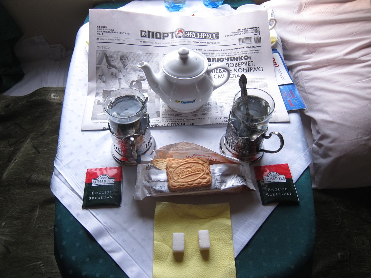 На столе в купе уже поджидал журнал "Саквояж СВ", буклет о поезде, буклет о лотереи, некоторые наименования кондитерской продукции по прейскуранту, а также чайник с двумя чашками.