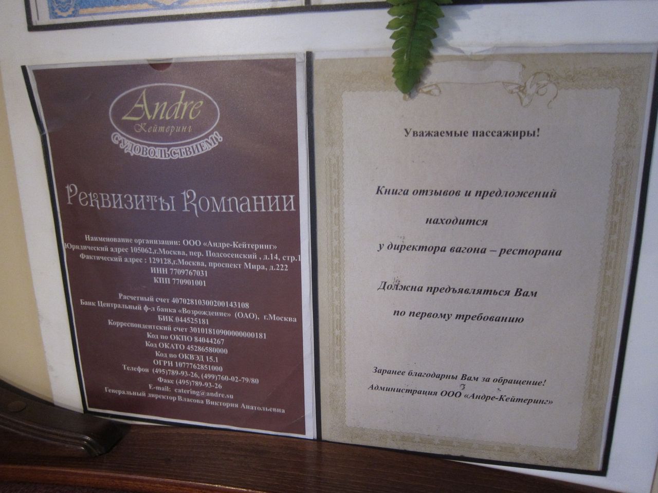 Ресторан в поезде обслуживается неким ООО "Андре-Кейтеринг":