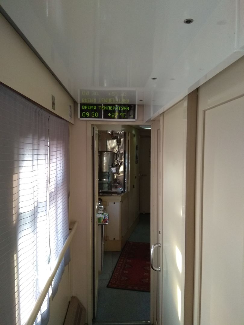 Что удивило: сравнительно новый вагон, вроде бы из серии тех же трансформеров, что ездил в мае 2017-го, но намного приличнее, не дребезжал так, и розетка под столиком имела место быть. Оба туалета - перед нерабочим тамбуром. Горячая вода была почему-то только в одном из них (в том, что ближе), но вода уходила просто с ужасающим звуком в обоих ЭЧТК. Ещё удивило табло температуры в вагоне: с одной стороны оно смогло показывать +27, с другой - +30. Напротив проводника висела предвыборная агитация одного из кандидатов в президенты, начальник сказал, всё оплачено официально по договору с ФПК. Ещё висела рекламка доппитания за сравнительно умеренную плату.