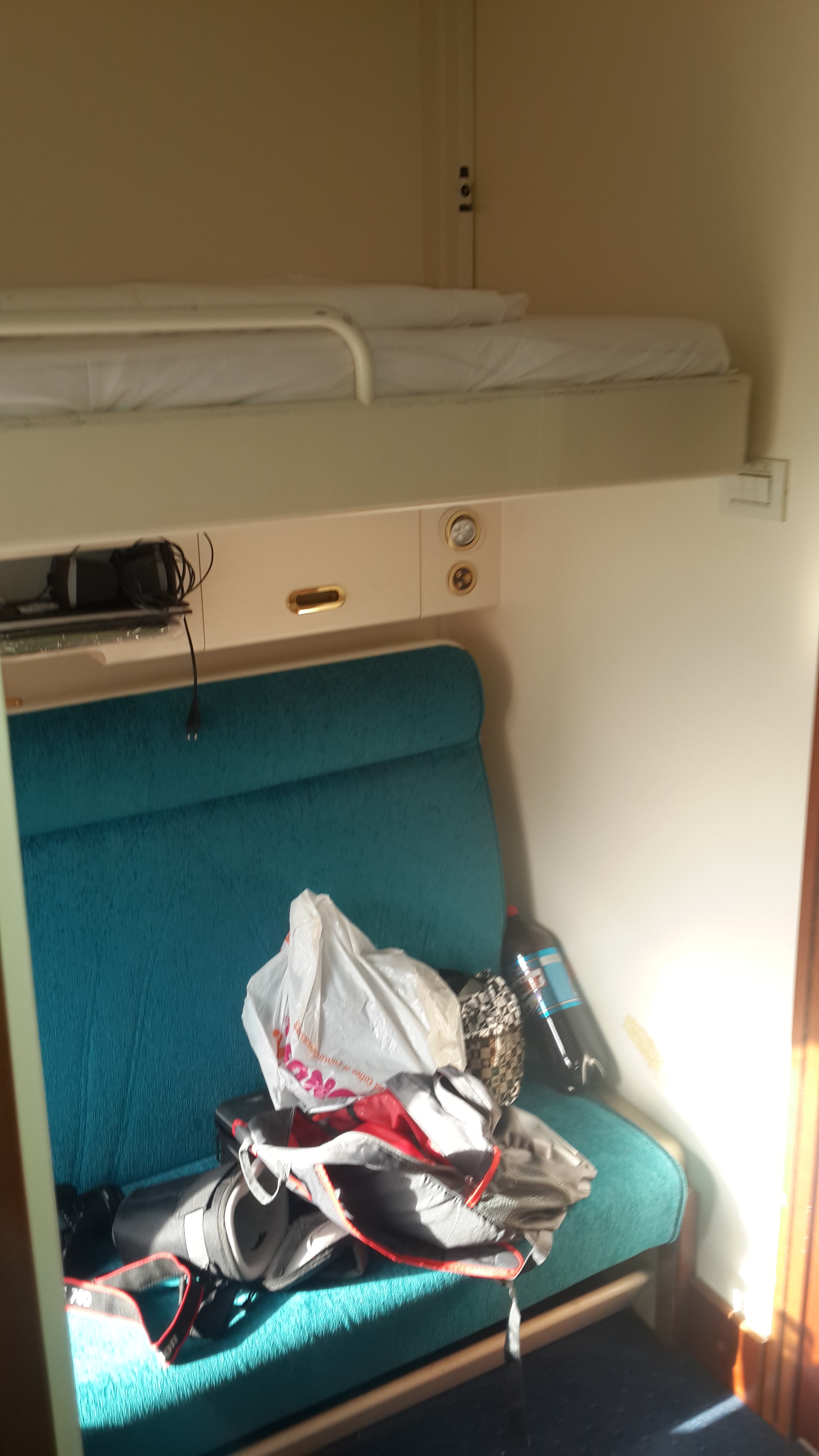 4. Вагон шикарен. Ехали в мягком впервые. Не "Гранд экспресс", конечно, по отделке. Но все атрибуты мягкого в наличии. Чисто, удобно, комфортно. На столе вода и фрукты, белье идеальное. В туалете полный комплект принадлежностей. В шкафу, как положено, халаты. Шкаф, кстати, огромен и в него без проблем влезли два наших немаленьких чемодана, не помешав при этом стоявшей там лестнице.