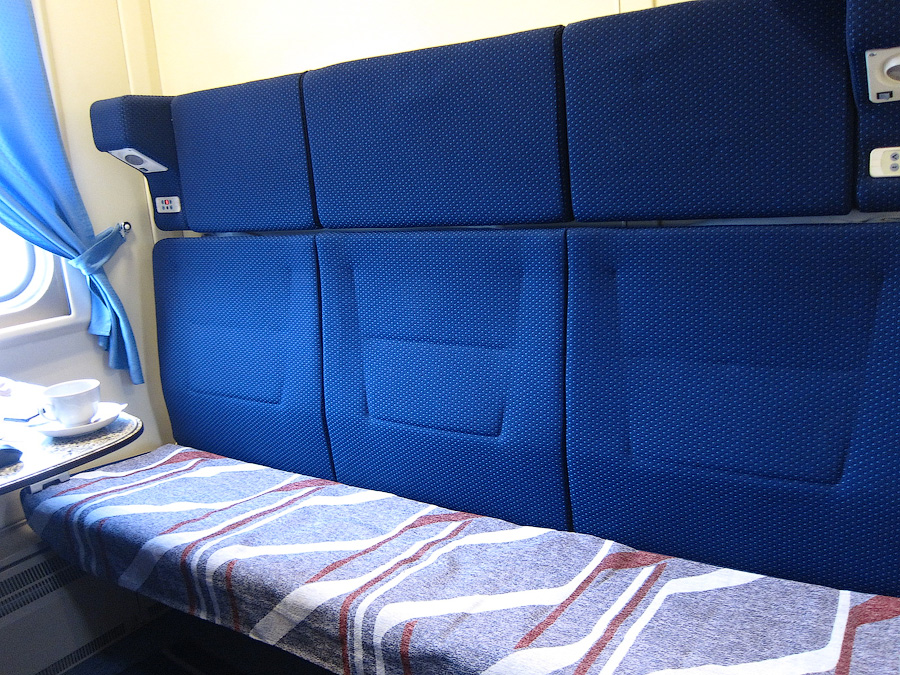 Ощущения усиливались тяжеленными и жесткими спальными местами. Не знаю кто их проектировал, но в пути на этих диванах сидеть не удобно: жестко, болит спина. Спать тоже трудно: опять же жесткость и узость спального места. приделанные сборку полки для вещей (?) нависают прямо над головой и тоже создают дискомфорт.