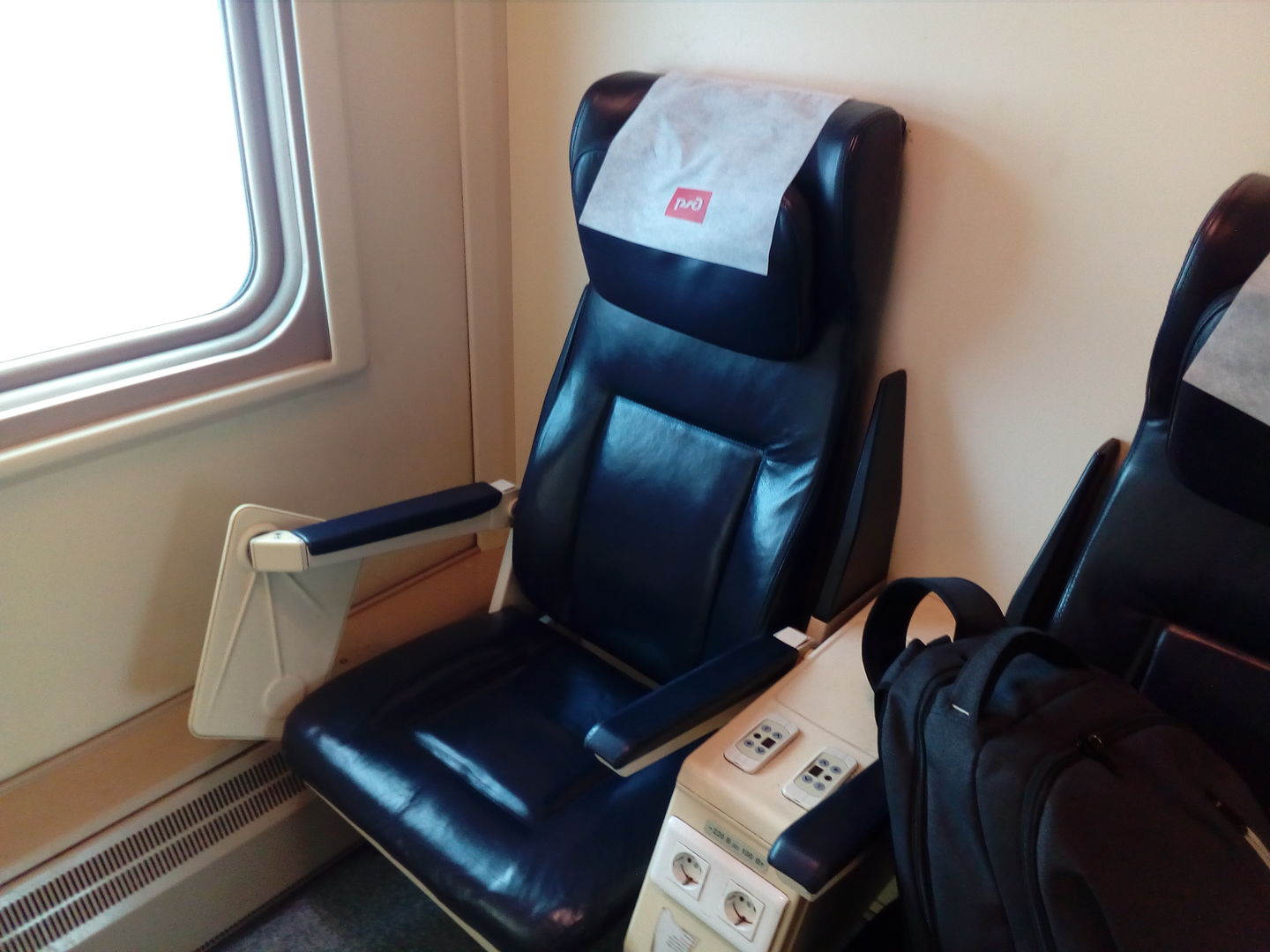 Началась посадка, заняли свои места, моё в ряду по два места, в передней части вагона. Поскольку нумерация у этого поезда из Белгорода с головы, то моё место оказалось спиной вперёд. В пятом вагоне, а также, предположительно в четвёртом и в третьем между креслами есть одна розетка на двоих. Также в этих вагонах сиденья кресел слегка выдвигаются вперёд.