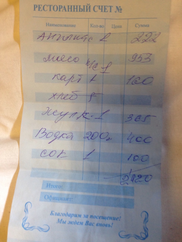Однако, помня, что в меню цены заканчивались на "нули" - поинтересовался у официантки - почему цена на жульен и салат не соответствует ценам меню, на что получил ответ, что 10% наценка за обслуживание "раскидана" по разным блюдам. Увидев, что я собираюсь пересчитать цены на телефоне, официантка сказала, что может и накинула сотню-полторы, ибо "не нае...шь - не проживешь". Услышав столь откровенный ответ, и пребывая в хорошем расположении духа - добавил еще 100 рублей к ранее выданным 2 500 и вернулся к себе в вагон.
