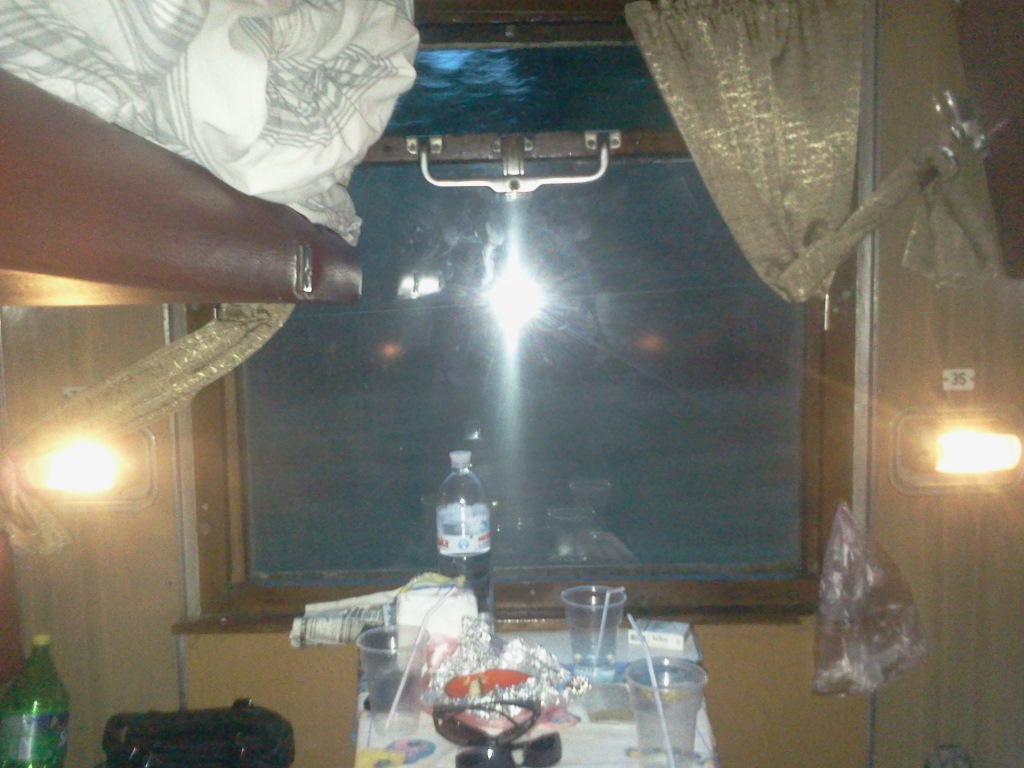 Внутри обычные старые купе, кондиционера нет, поэтому жарко и душно. Окно в нашем 9 купе не открывалось, позвали механика он открыл его с помощью лома. Позже вечером когда пошел дождь мы изо всех сил пытались закрыть окно, но оно не закрывалось, при этом на нас во внутрь начала выпадать рама. Решили больше окно не трогать. Всю ночь в окно летели брызги дождя. Освещение в купе очень слабое. Верхний свет что есть, что нету, в основном купе освещал свет от четырех боковых ламп.