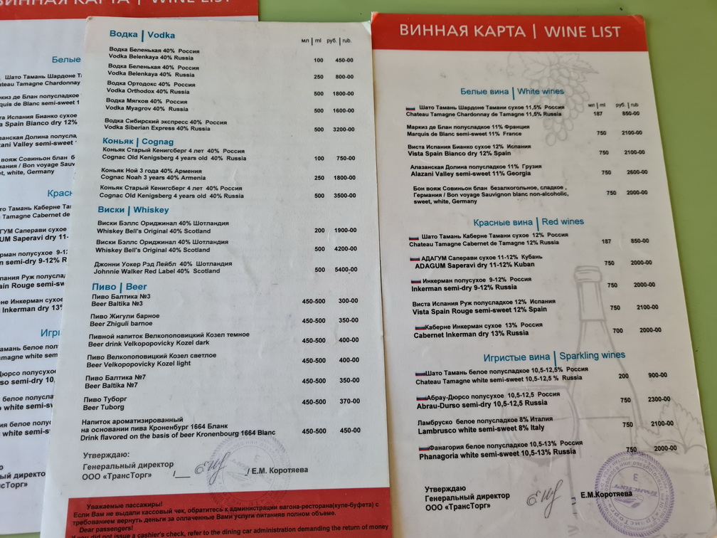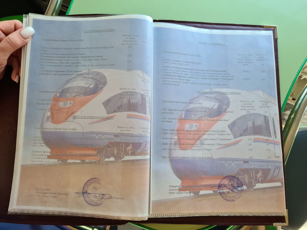 В поезде внезапно обнаружился незаявленный вагон ресторан. Фото меню прикладываю. Но с такими удобными остановками по одному часу в Ростове и Кропоткине нет проблем добыть еду вокруг вокзалов. В моем случае было КФС в Ростове.