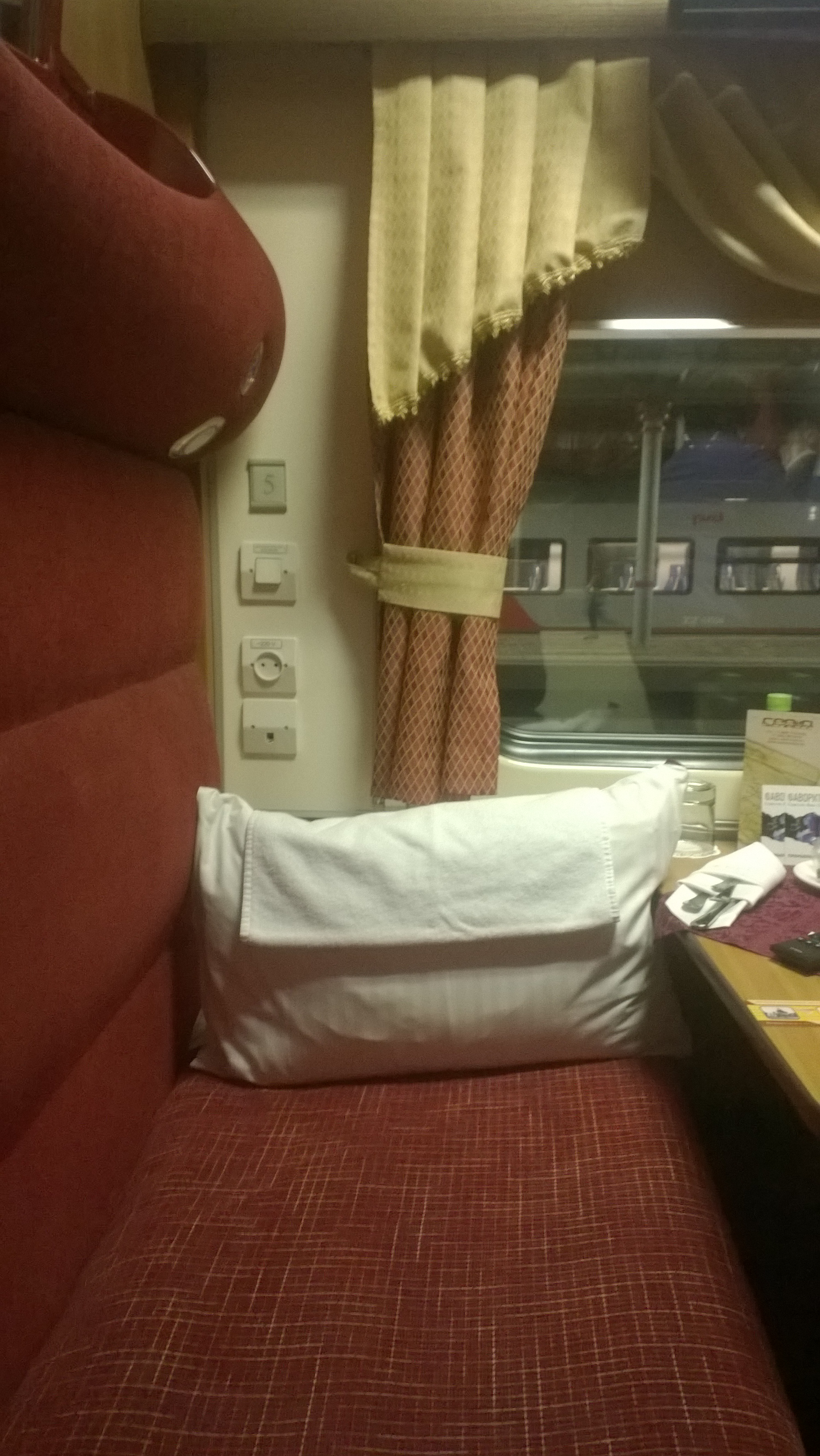 . Постели заправлены, одеяла легкие, причем с пододеяльником - первый раз вижу такое. Класс числился 2Э. Давали сухпаек, тапочки, набор всяких одноразовых штучек (складная зубная щетка, крошечный тюбик с пастой, расческа, мыльце, ложечка для обуви, влажная салфетка, салфетка для обуви). Электронные карточки. Одну, кстати, упер случайно с собой, но вернул потом. Туалет чистый. Видимо, я отстал от жизни, впервые увидел биотуалет в поезде. Вода горячая и холодная, льется, как из домашнего крана. Удобно, не надо пимпочку рукой нажимать. Прежде не случалось ездить в таком классном вагоне, хотя, наверное, с чем сравнивать смотря.