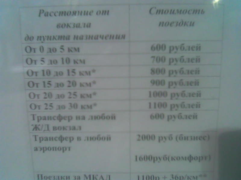 На мой взгляд уместней спросить - пользовался ли, вообще, кто-либо когда-либо из участников форума РЖД-такси. У меня ощущение, что ответ будет отрицательным. Новый прайс - это тот, который приведен на фото в моем сообщении? Если да, то не согласен, что цены сопоставимы.Slon:Народ, а кто-нибудь пользовался в последнее время РЖД-такси? Я случайно обратил внимание на новый прайс (правда, оказывается, что ему больше года - вот что значит не езжу) - так после убирания дебильных зон по многим направлениям цены уменьшились и вполне сопоставимы с другими возящими конторами. Понятно, что если отойти от вокзала или ехать не до вокзала, то цифры будут меньше, но этот вариант я не считаю, он понятен