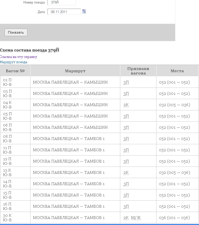 В данном конкретном случае всё дело в тамбовской и камышинской группах. Схема показана для камышинской группы, уж почему они не показывают при этом тамбовскую не знаю. В тамбовской группе 08.11 действительно будет 2 вагона купейных, 13 и 30, 30 м/ж, в камышинской группе будет только один купейный вагон 04. Это остаток от праздничной схемы, когда обе группы были в полном составе.Sanchez:У меня вопрос по поезду 379 Москва-Камышин. Дело в том, что в схеме существует вагон №0 - купе м/ж, но в системе билетов в этот вагон на 08.11 я не наблюдаю, также не может быть такого, чтобы все места вдруг выкупили в один момент, вопрос что с местами в этот вагон?
