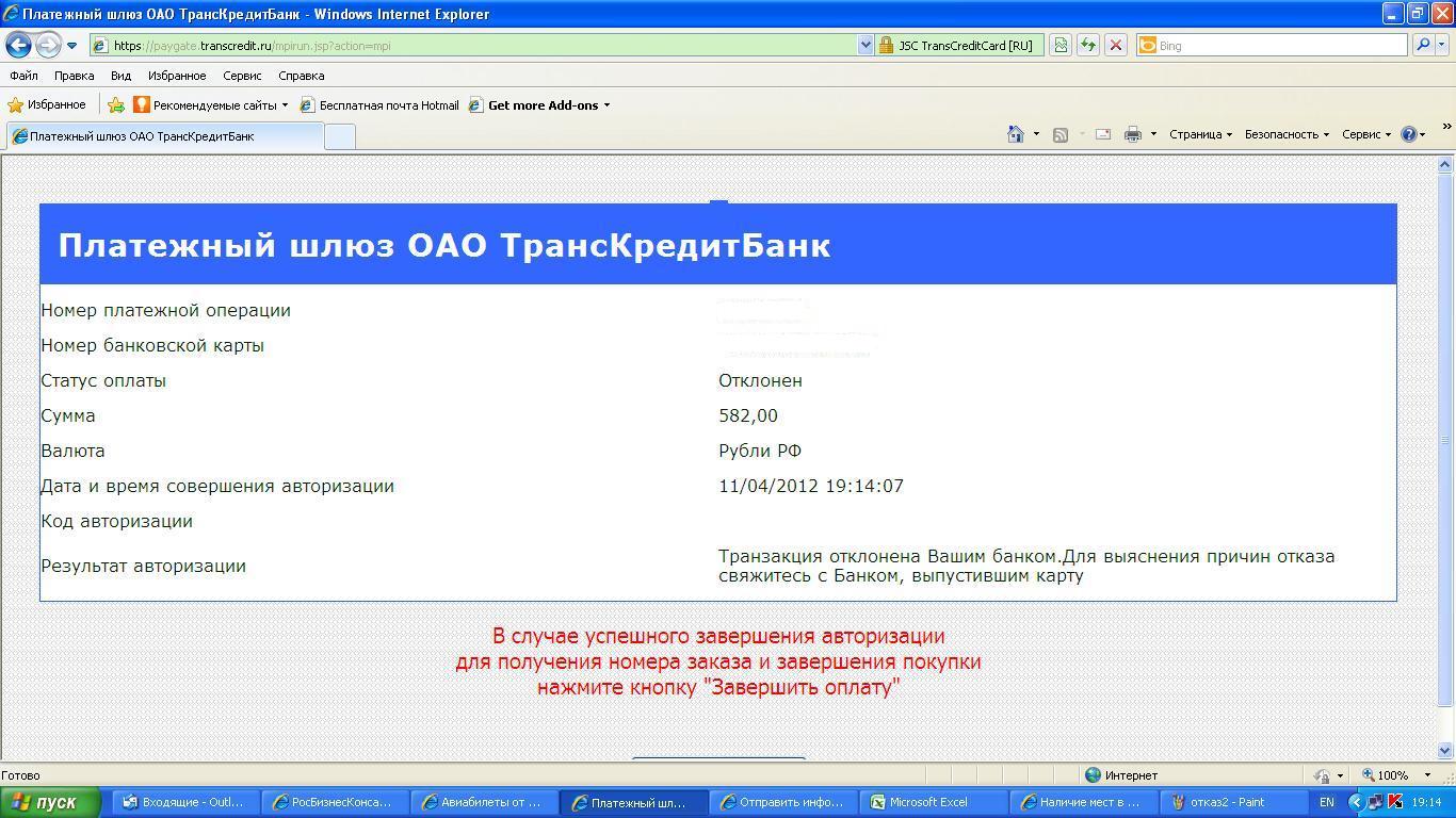 11 апреля три авторизационных запроса, поступившие в процессинговую систему Сбербанка России, были отклонены по причине того, что Вы не прошли аутентификацию в рамках технологии Verified by Visa/MasterCard Secure Code (не введен одноразовый пароль). Очевидно, не произошло перенаправление Вас на страницу аутентификации Сбербанка России https://acs.sbrf.ru для ввода одноразового пароля. В настоящее время в соответствии с политикой безопасности Сбербанка России, если сайт использует технологию Verified by Visa , но аутентификация не пройдена, в операции будет отказано.