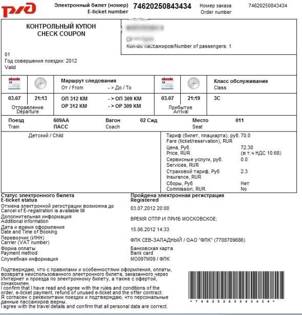 При заказе электронных билетов через Интернет Вам будет оформлен КОНТРОЛЬНЫЙ КУПОН, который является документом строгой отчетности, но для посадки в поезд не действителен.