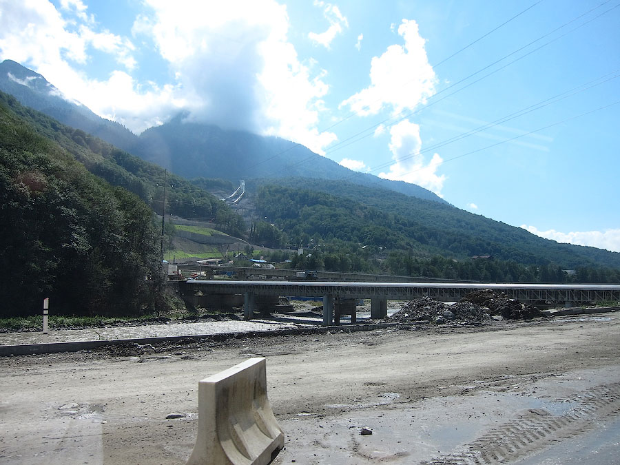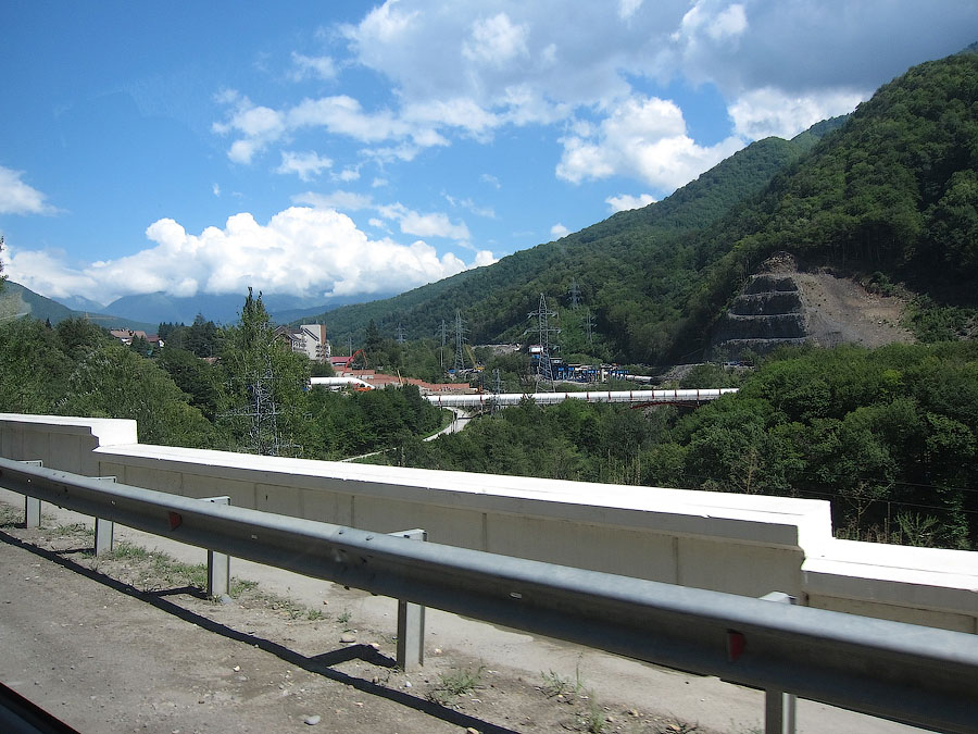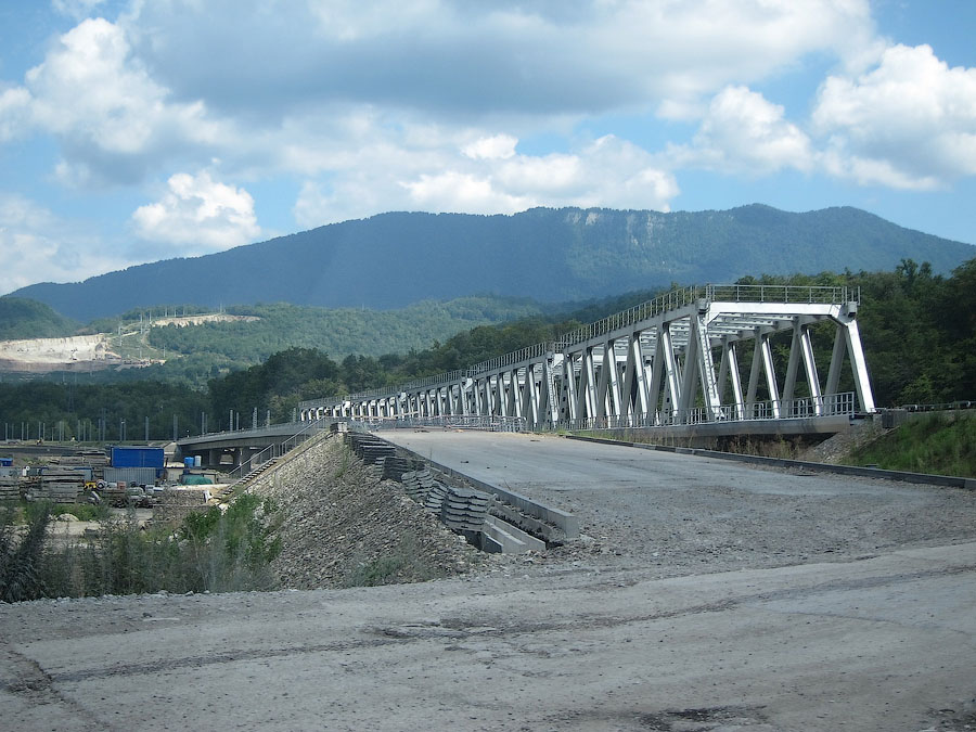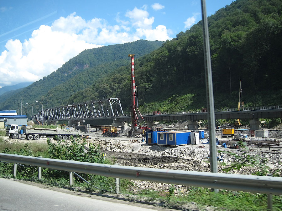 По непосредственной дороге на Красную поляну заметно активное строительство совмещённой автомобильно-железной дороги вдоль русла реки Мзымты. Во всяком случае эстакады и многочисленные балки мостов уже на месте. На многих отрезках установлены опоры КС, дожидается укладки решетка.