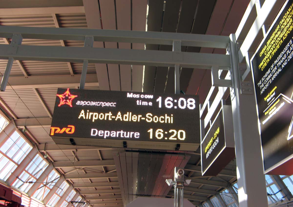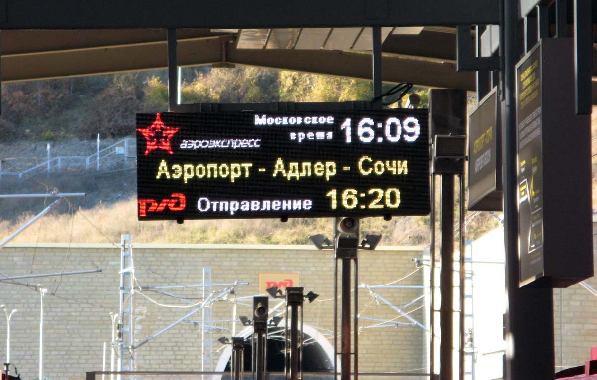 Итак, аэроэкспрессы по маршруту Сочи - Адлер - аэропорт Сочи курсируют нынче 5 раз в сутки. На участке Сочи - Адлер есть пригородный тариф - 50 руб., для таких пассажиров предназначен последний из Сочи вагон, он попроще внутри, а-ля обычные новые подмосковные поезда. Остальное вполне соответствует фото выше. Класс стандартный Сочи - аэропорт стоит 200 руб., бизнес-класс - 350 руб., в пути 45-50 минут. Галерея в аэропорту смахивает на таковую в Домодедове.