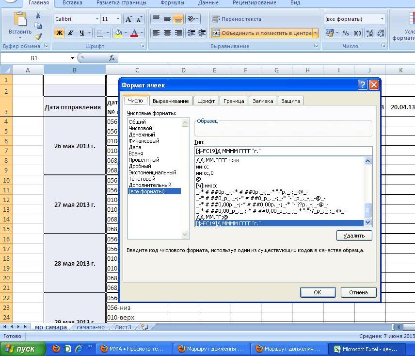 Главная-Число-Другие числовые форматы- Все форматы в строке "тип" вводите значение "ДД.мм.ГГГГ ДДДД"- день недели указан полностью, либо "ДД.мм.ГГГГ ДДД"- день недели будет указан сокращено, и нажимаем "ОК"serg:можно ли задать в Excel-таблице формат даты таким образом, что б отображался и день недели?