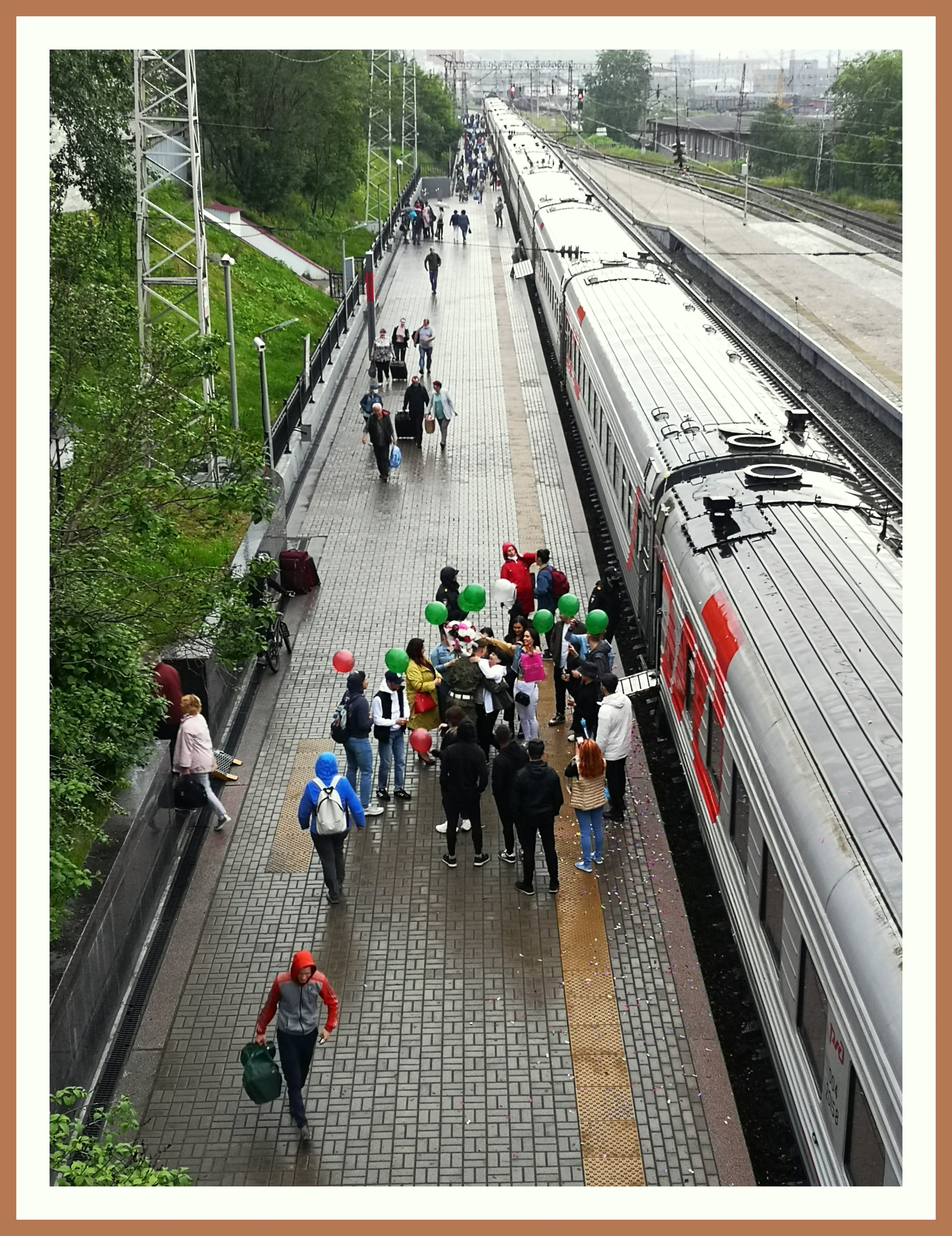 Ожидая поезд обнаружил на 11-м пути стоящий состав из новеньких вагонов. Был поначалу обрадован, но, к сожалению, это оказался поезд на Вологду. У меня было много вещей с собой, и поэтому я решил вначале сесть в поезд, а дальше добежать до камеры хранения и забрать оставшиеся вещи. В итоге при отправлении поезда в 19.48 состав пригнали из тупика только в 19.25. Вдоль платформы выстроилось много призывников, отправляющихся на Север (куда-не знаю, это их тайна), пассажиров было очень, да так, что в некоторых местах на платформах Ладожского вокзала пройти было практически невозможно. Тем не менее, я всё успел.