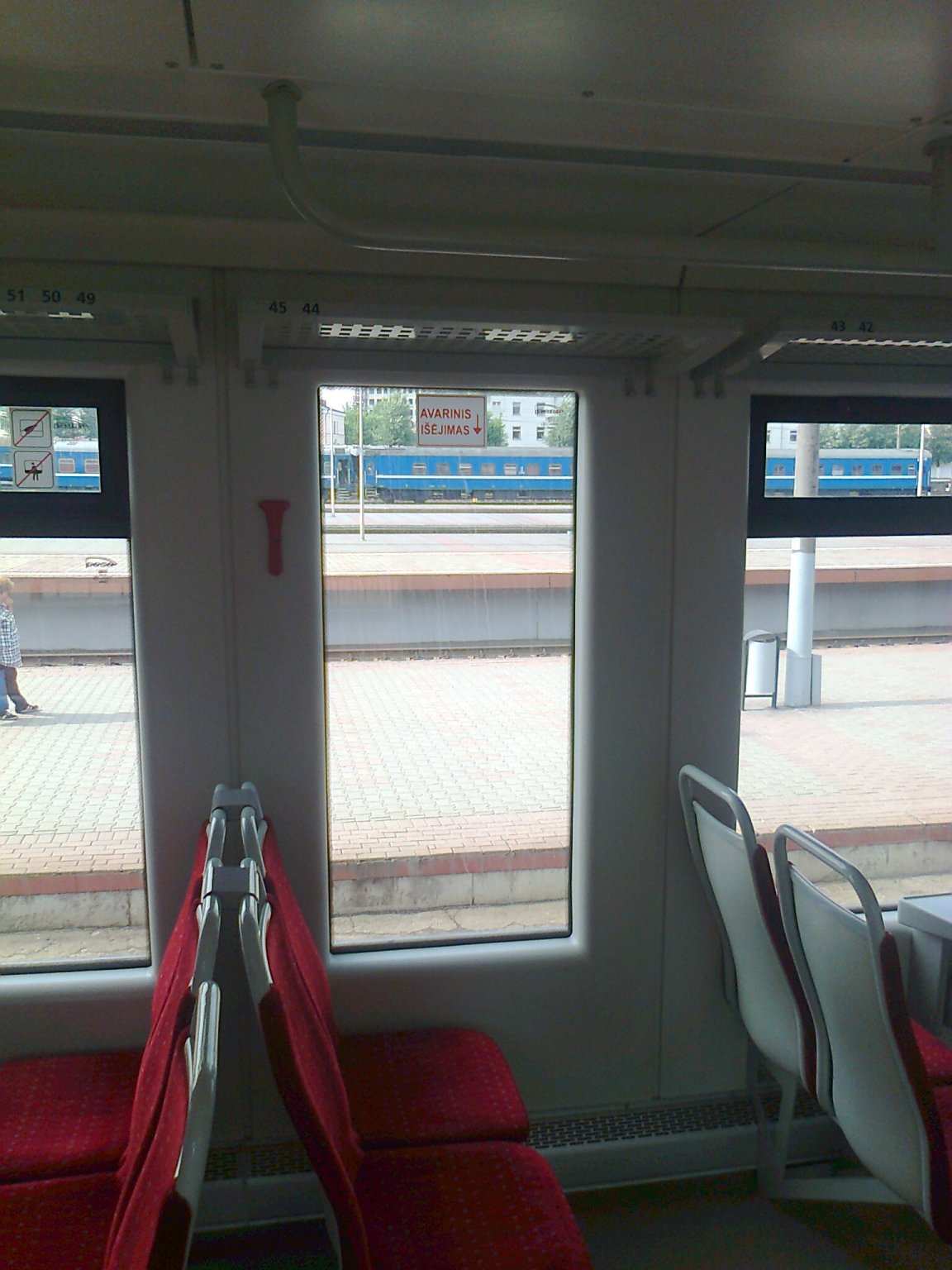 Салон дизеля чист, поскрябонностей и потертостей нет, не пыльно. Само расположение сидений в салоне смахивает на городской автобус и в принципе не предназначено для передвижения по межгороду с временем хода 2,5+. При росте 186 сидеть друг на против друга с подобного же роста соседом нет никакой возможности :(. Рассаживались в шахматном порядке - благо, что свободные места имелись. При покупке билета ориентировался на схему украинского штадлера и прокололся, "хорошие" места не совпали. Оптимальными местами на данном маршруте являются №№44-45, они лишены соседей напротив и расположены по ходу поезда.