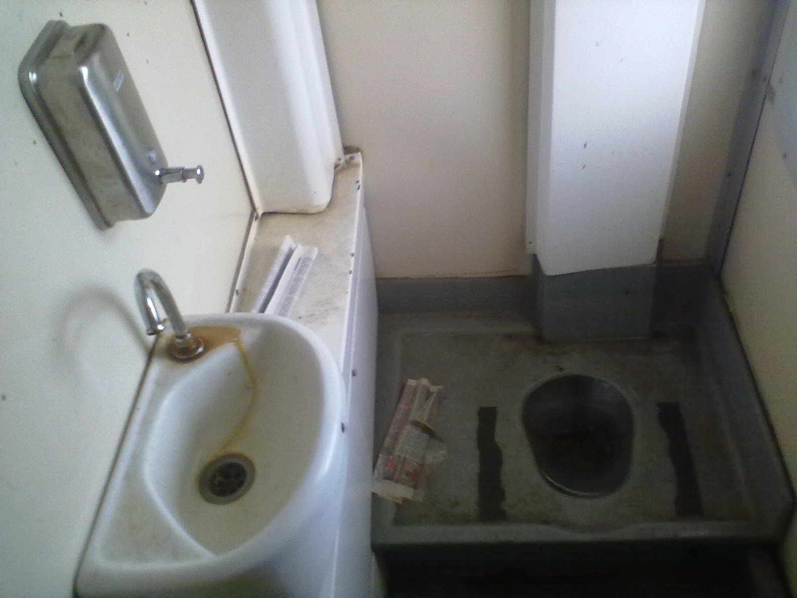 Туалет. Здесь уже почище, чем в МК-0075. Запаха нет. Правда, ни воды, ни мыла тоже нет. Всего в составе три туалета: один в головном вагоне и два в промежуточных: