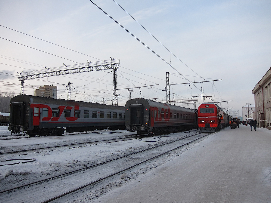 Состав поезда на станции Пермь-II под ЭП2К-086 (слева в кадр попал плацкартный вагон поезда №002М "Россия" Москва - Владивосток):