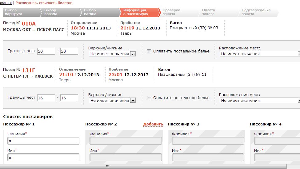 serg:Что-то новенькое? Или особенность оформления билета на конкретный поезд 004 Москва-Питер? После заполнения всех данных, включая диапазон границ мест, к примеру 16-16 - система не дает перейти к следующему этапу пока не будет указано предпочтение - верхнее или нижнее место требуется, выдается сообщение "укажите количество верхних и нижних мест".