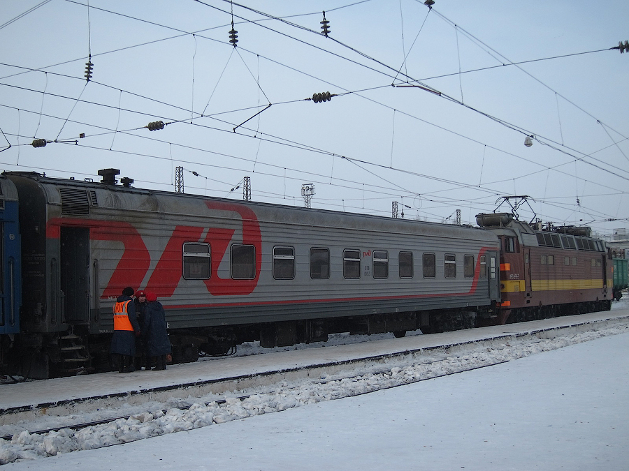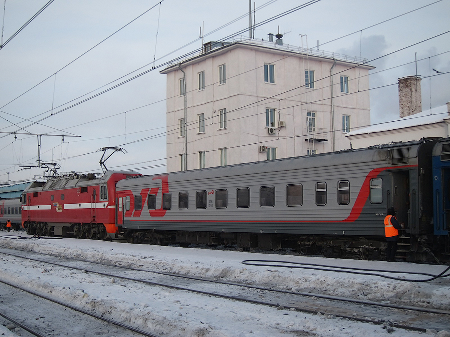 Состав поезда на станции Пермь-II под ЭП2К-086 (слева в кадр попал плацкартный вагон поезда №002М "Россия" Москва - Владивосток):