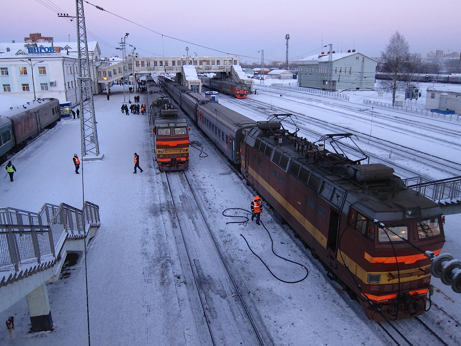 Поезд (средний состав на фото) прибыл на станцию Пермь-II. Справа (на первом пути) состав поезда №002М "Россия" Москва - Владивосток, слева - состав поезда №099Э Владивосток - Москва: