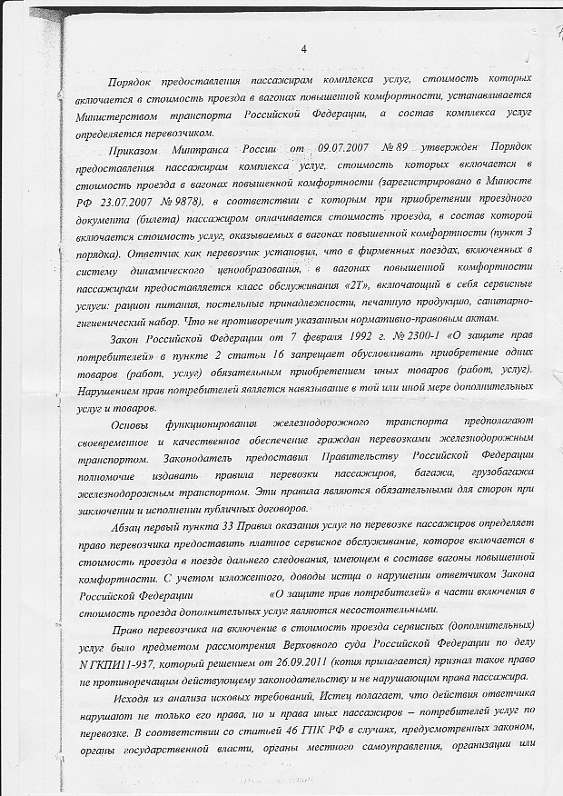По результатам рассмотрения обращения заявителя Новосибирским транспортным прокурором в Железнодорожный районный суд г.Новосибирска направлено заявление о запрете противоправных действий ОАО «ФПК» по взиманию стоимости дополнительных (сервисных) услуг при проезде в фирменных поездах.