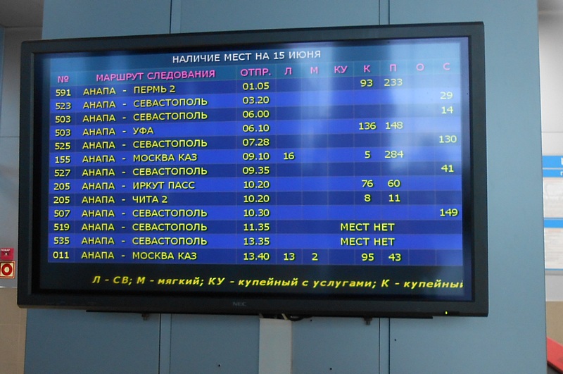 Вот и на Анапском вокале, на большом табло видны свободные места на все отправляющиеся поезда. в том числе и на "шинокопытные" поезда Анапа-Севастополь. Но вот купить билет из Анапы в Севастополь все же нельзя. Задал вопрос в справочной ЖД вокзала, почему так? В ответ было многомногобукфф, но главный смысл: "Раз вы здесь, в Анапе, то вам в Крым ехать не зачем"...