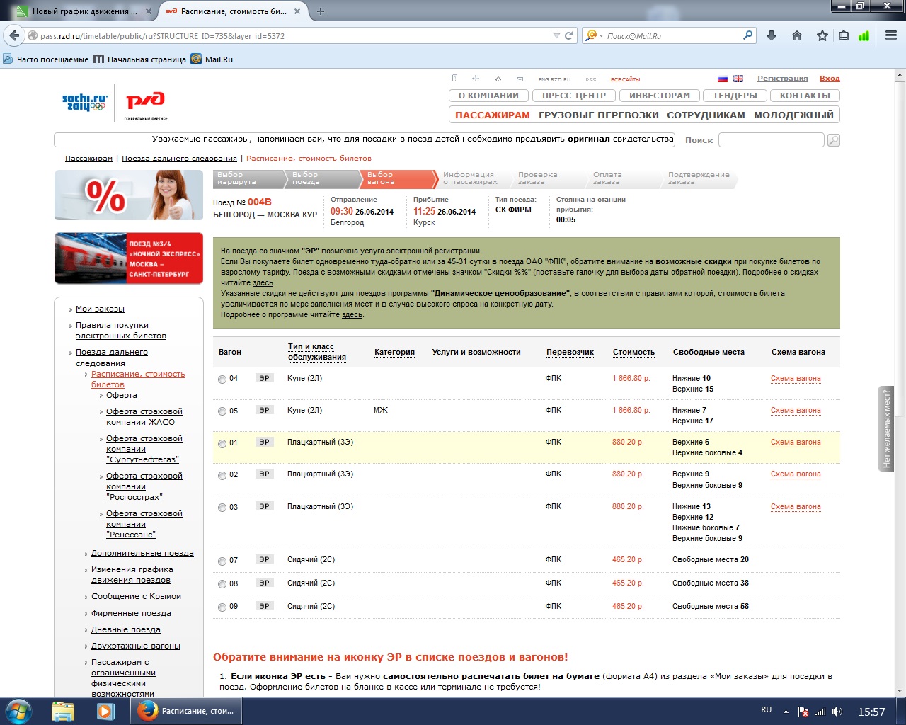 bodun » 24-06-2014, 13:00:Да, действительно, сделали 004 ежедневным, но закрыли продажу в сидячку 2 класса везде, кроме Белгорода. Из Курска на него только с услугами. Выгоднее брать билет от Белгорода во 2 класс с посадкой в Курске (разница 300р). Идиотизм..