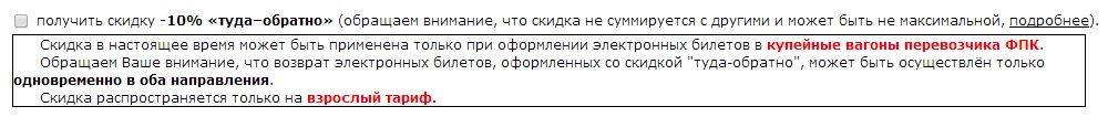Sonik: Беда. Пытаюсь купить билеты на поезд 087Г на двоих. Выбираю два места в купе в одну сторону и два — в купе в обратную. Стоимость по официальным ценам из поиска с главной страницы сайта РЖД — 30 946.80 рублей. Довожу до момента, где можно выбрать скидку "-10% туда-обратно". Ставлю галку. Сумма получается 34 509.20 рублей!