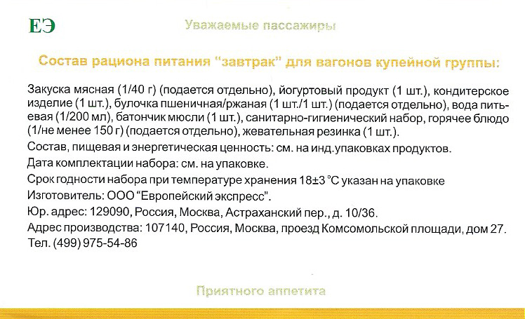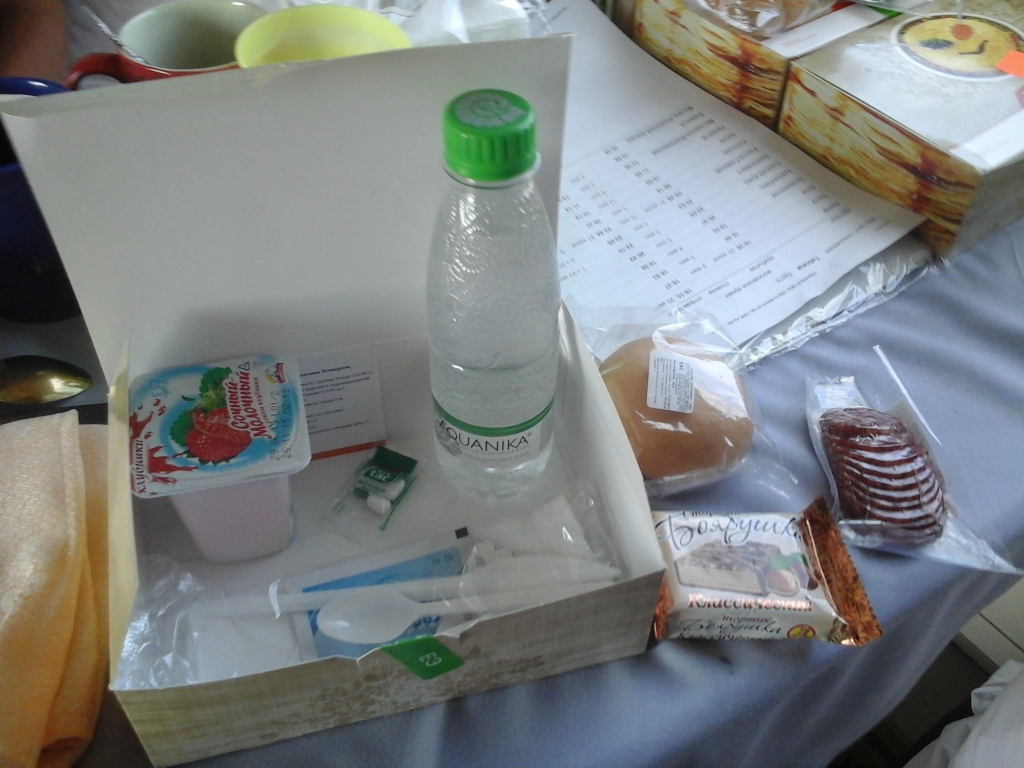 На столе стояло 4 пайка – там была колбаса, булочка, малюсенькая бутылка воды, йогурт, кексик, чайный пакетик, дорожный набор типа ложка-вилка-ножик-… Возможно, что-то и подзабыл, но основное точно перечислил. Чуть позже принесли запеканку, есть можно – я подогрел у проводницы в микроволновке и съели. На этом бесплатная еда кончилась. Обратно набор немного отличался – почему-то колбасу дали не сразу, и булочки поднесли позже. Проводница посетовала на ресторанную бригаду. О ней чуть позже.