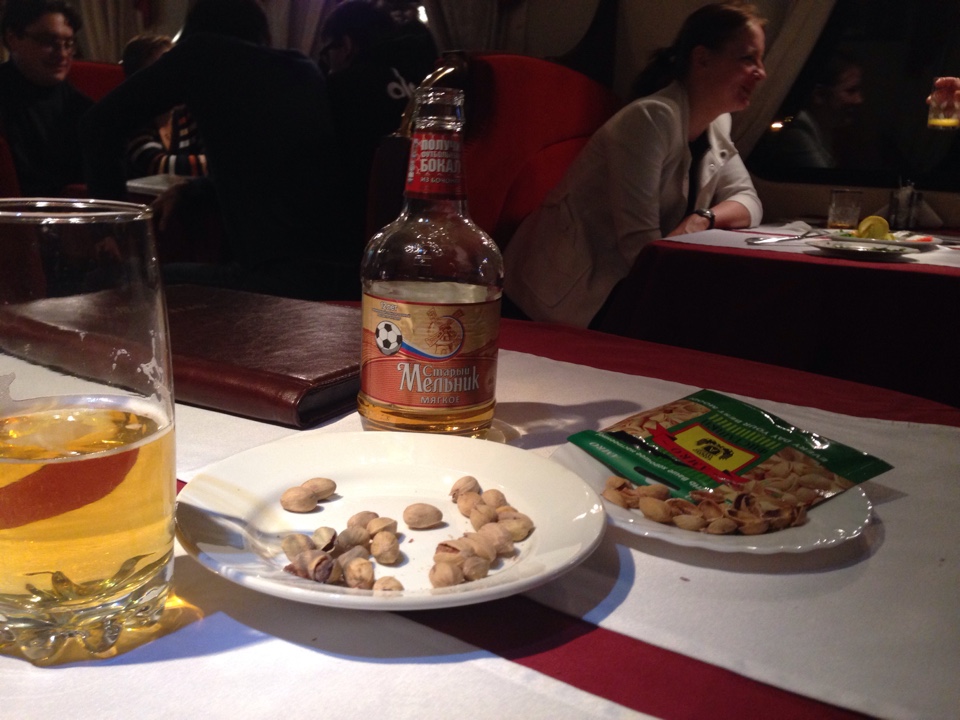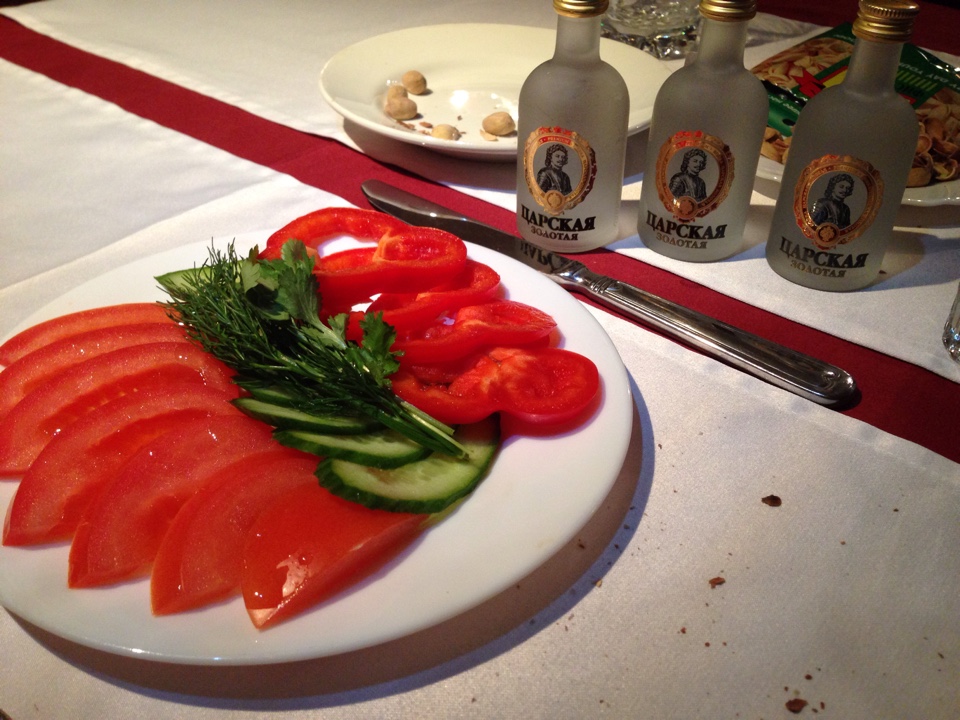 Но потом узнал, что есть в наличии водка (дорогая, зараза, аж по 300 рублей за 50 грамм), заказав ее, перешел на закуски: