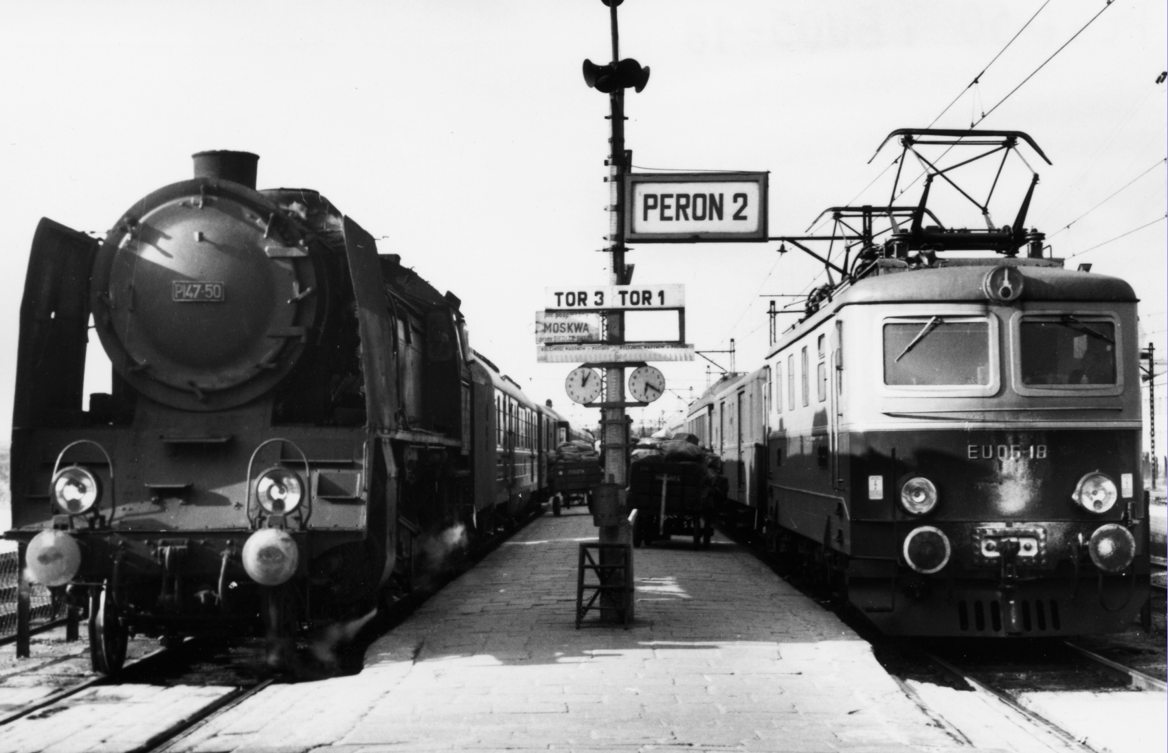 Początek lat 80-tych EU07-052 i EP08-012 z wczesno-popołudniowymi składami do Berlina i Paryża.