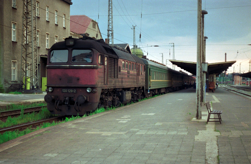 Am 27.08.1991 habe ich mal den Lokwechsel bei einem Russenzug, dem D 1196, beobachtet. Die Frankfurter 130 077-1 brachte den Zug durchs Oderbruch nach Eberswalde und die Eberswalder 120 129-2 fuhr ihn dann weiter in Richtung Norden (über Templin).