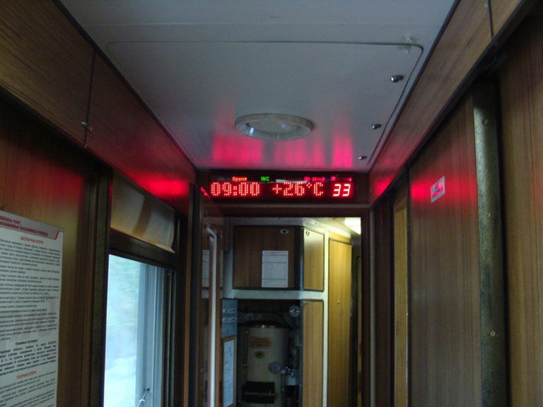 4) В вагоне чисто, в проходе - дорожка, в купе тоже. В туалете присутствует бумага, мыло. В каждом купе разетки для подзарядки мобильников, светильники работают, основное освещение тоже. В корридоре электронное табло с индикаторами туалетов, температурой воздуха, датой и временем. Часы спешат на 30 минут. Туалет - БИО. Ночью, изза сильной работы кондея стало холодно.