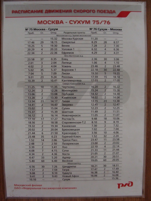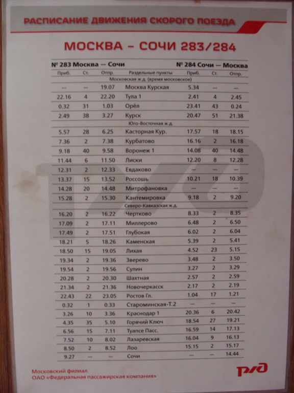 7) Поезд Московской ж.д. Возможно в общем обороте с поездом 75 Москва - Сухум. Расписание в вагоне висит и на поезд 283 и на поезд 75. В Орле подцепили 2 вагона Орел - Сочи. Следовавали согласно графику, Опаздания +- 2-3 минуты были, но редко.