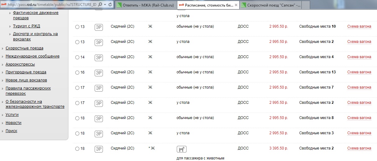 Места для пассажиров с животными только в вагоне №8 (№18) и их всего два - 65 и 66. И стоят такие места на 400 рублей дороже. И помечены как *Ж.