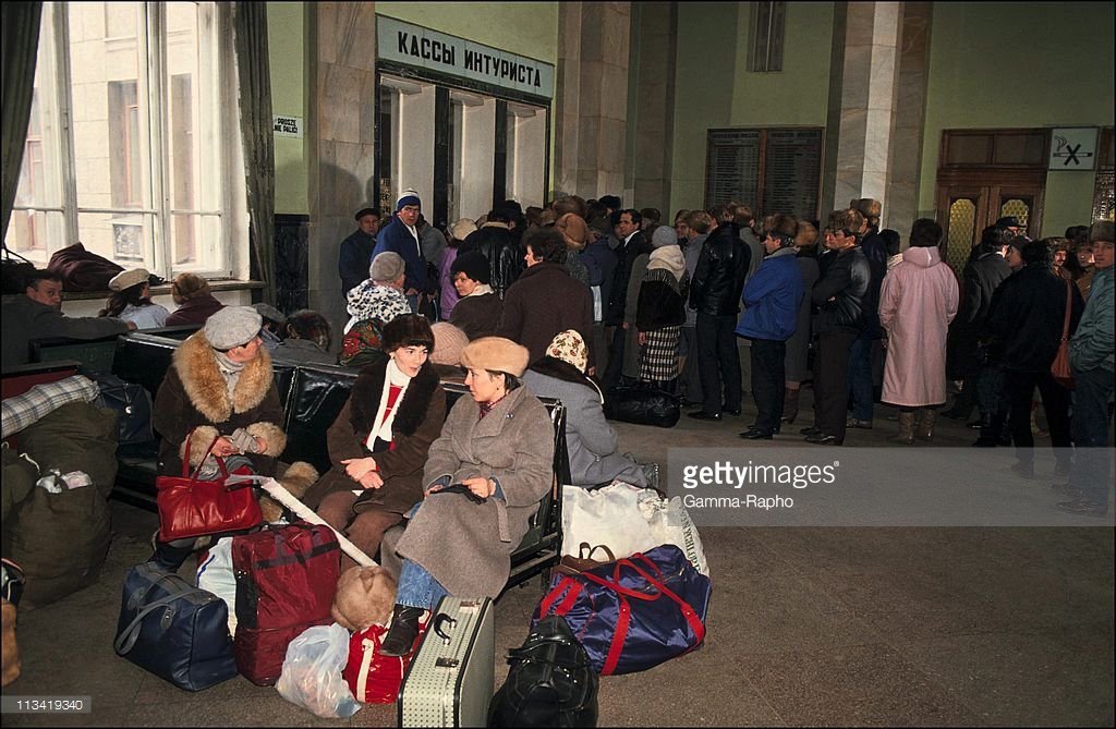 http://www.gettyimages.at/detail/nachri ... o/50593540 Rail passengers carrying shopping & overnight-sized bags packing platform, waiting to bd. train, at Belorussian train station, Moscow (February 19, 1992).