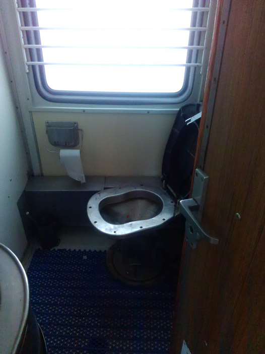 В-четвёртых, в вагоне был сломан один из туалетов. В нём не горел свет, был отломан кран, а дверь не закрывалась. Второй туалет был немного лучше, так как в нём стояло ведро с водой и ковшом.