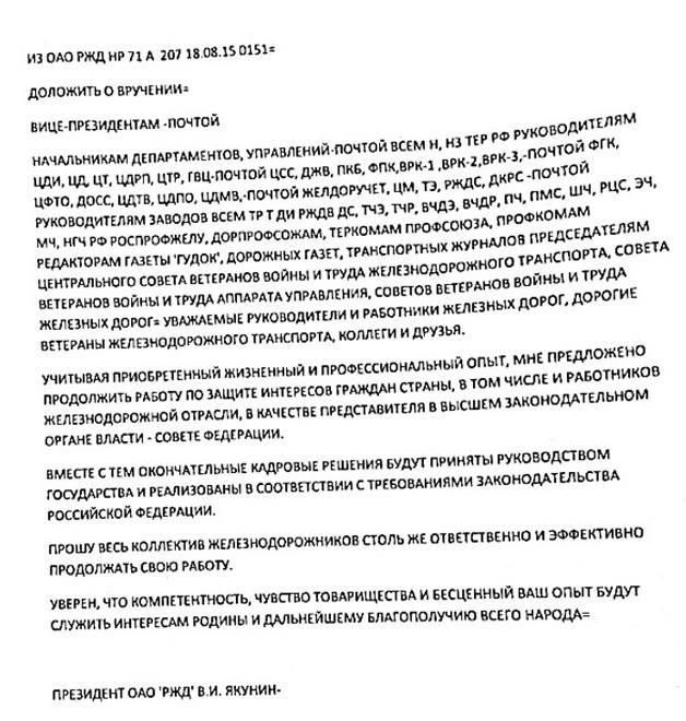 По словам топ-менеджера одной из компаний — контрагентов РЖД, Якунин хотел уйти со своего поста еще до Олимпиады, а дальнейшее пребывание на посту главы РЖД «становилось опасным» для него самого. «Компания ​настолько неэффективна и погружена в коррупционные схемы, что рано или поздно это бы закончилось плачевно», — рассказал собеседник издания.