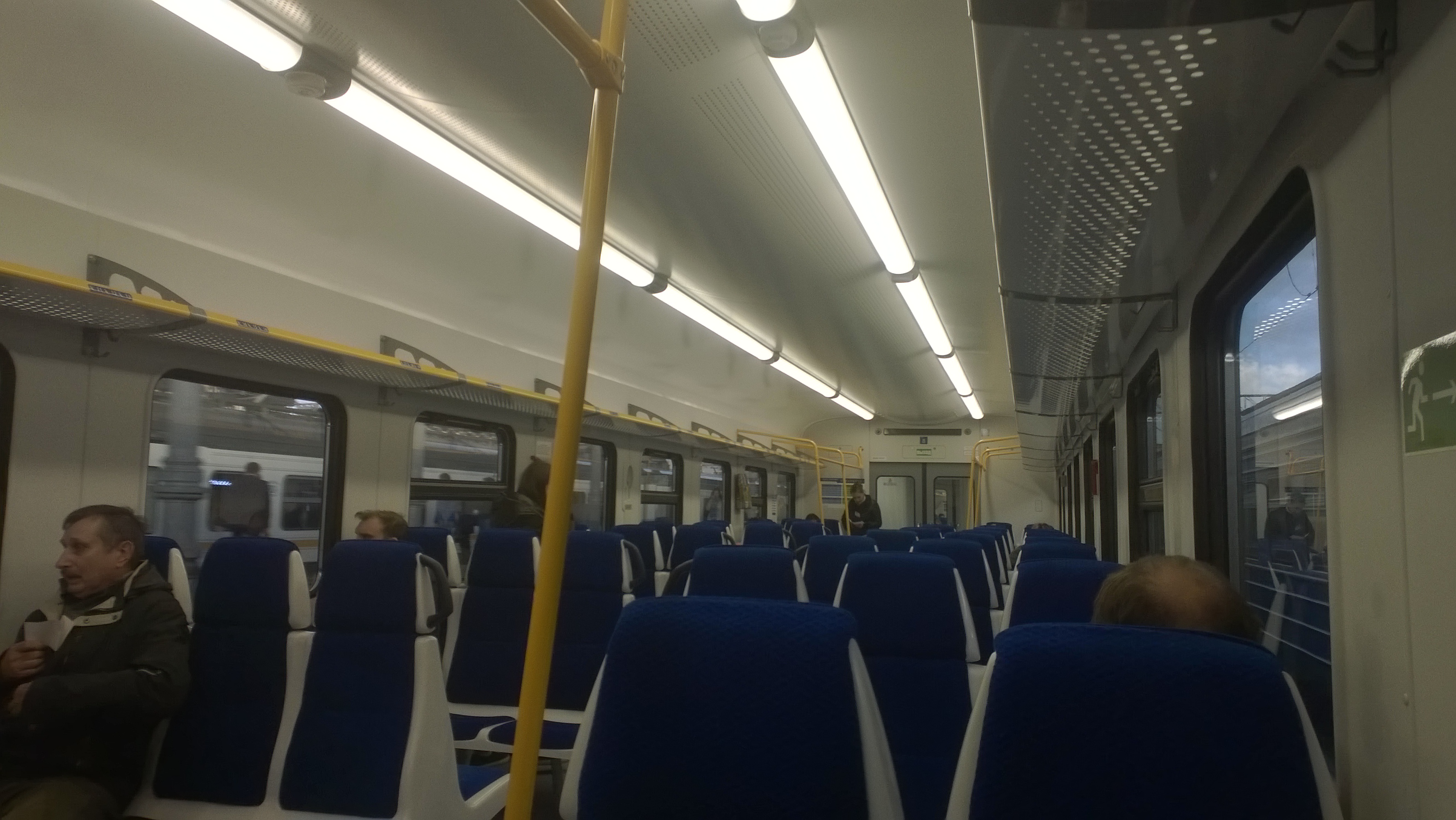 В то же время в вагонах без мест заполняемость уже по Москве была 70-80%, по Лосинке и Мытищам садились толпы народу - не удивлюсь, если в некоторых вагонах пассажиры ехали стоя. Ещё человек 30 садилось по Посаду, но это уже некритично.
