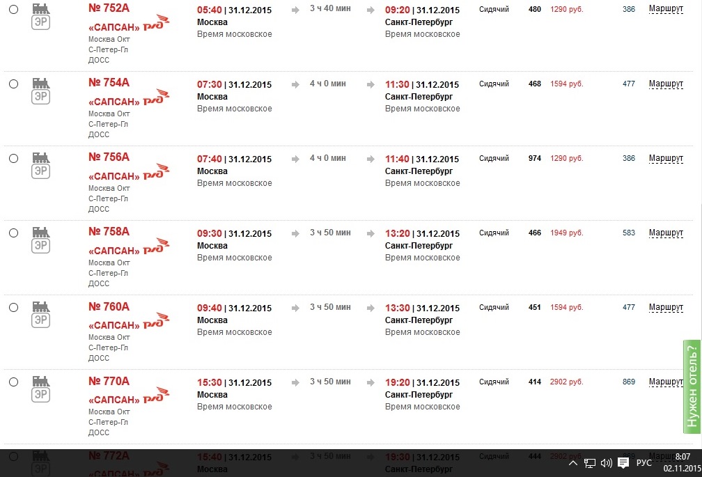 Может на 5-30 отменят ,на время общевыходных дней, он ,явно, меньше нужон будет.Это в Интернете на месяц. В кассах ДОСС и в самом Сапсане продаются нормальныеLandsberg » 02-11-2015, 06:40:А подскажите, школьные карты на Сапсан только на месяц теперь? Так понял на сайте РЖД . Были ж как-то дольше, вроде? То есть , чтобы со школьниками сгонять в каникулы с применением таких карт, нужно ее не раньше 11-12 декабря брать. А цена на билет будет уже выше?