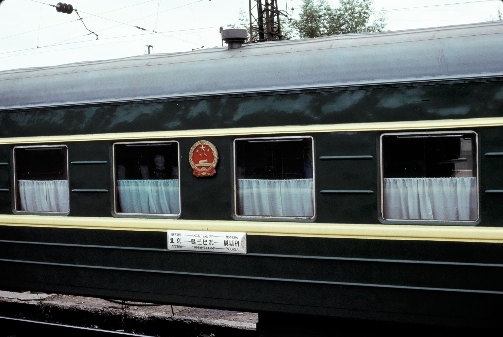 Transssibirische Eisenbahn, Wagen schrift Moskau - Ulan Bator - Peking (1979).